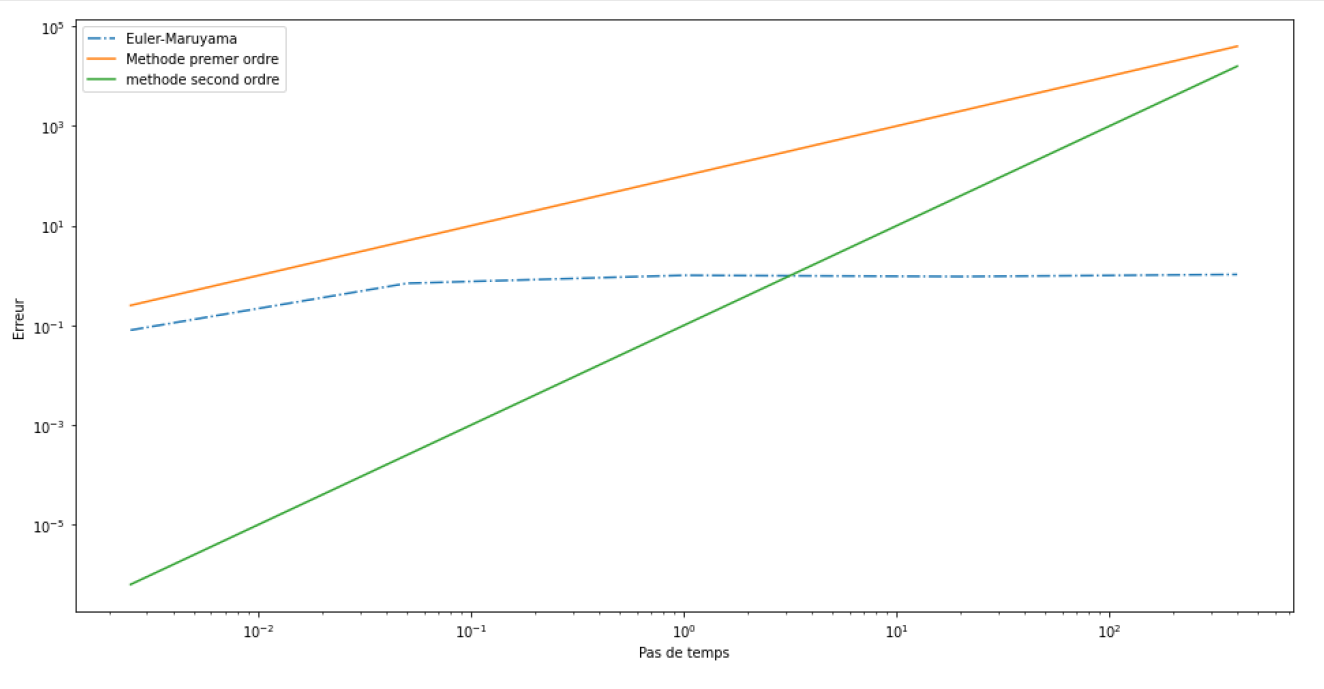 On peut estimer l’ordre de la méthode stochastique expérimentalement (ici en comparant l’erreur avec l’intégrale exacte ou intégrale mieux estimée d’une fonction test par une autre méthode où l’analyse nous assure l’ordre) dans ce cas on peut voir qu’avec une intégration Euler Maruyama, notre intégration est estimée au sens faible du premier ordre, et dans ce cas on vérifie qu’elle du premier ordre au sens faible.